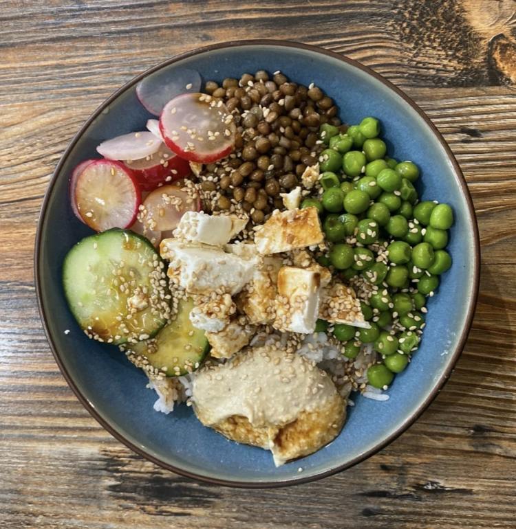 - Une base de protéines et féculents : ici sous forme de complémentation de protéines végétales avec les lentilles et le riz, ainsi qu’avec les pois chiches contenus dans le houmous.