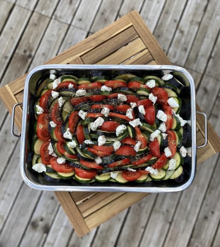 - Dans un plat à gratin, ranger alternativement vos légumes, placer les morceaux de fromage de façon homogène entre les légumes.